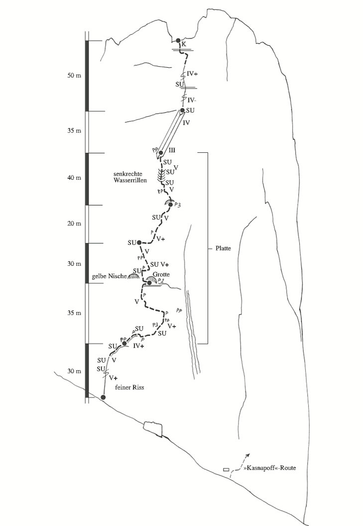 Sellagruppe. Schwierigkeit: V+, an den ersten vier Seillängen. Schlüsselstellen 6-, Höhenunterschied: 220 m. Kletterstrecke: 240 m. Seillängen: 7. Stunden: 3. Fels: ausgezeichnet. Ausrüstung: NAA + einen ganzen Satz Stopper