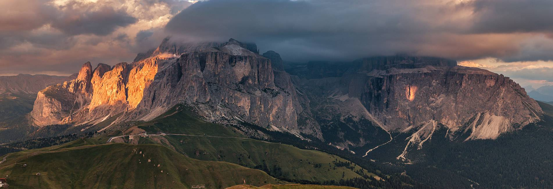 Umgeben ist die Sellagruppe, ein charakteristischer Bergstock der Dolomiten, von den vier Dolomitenpässen Grödner Joch, Pordoijoch, Sellajoch und Campolongo-Pass.