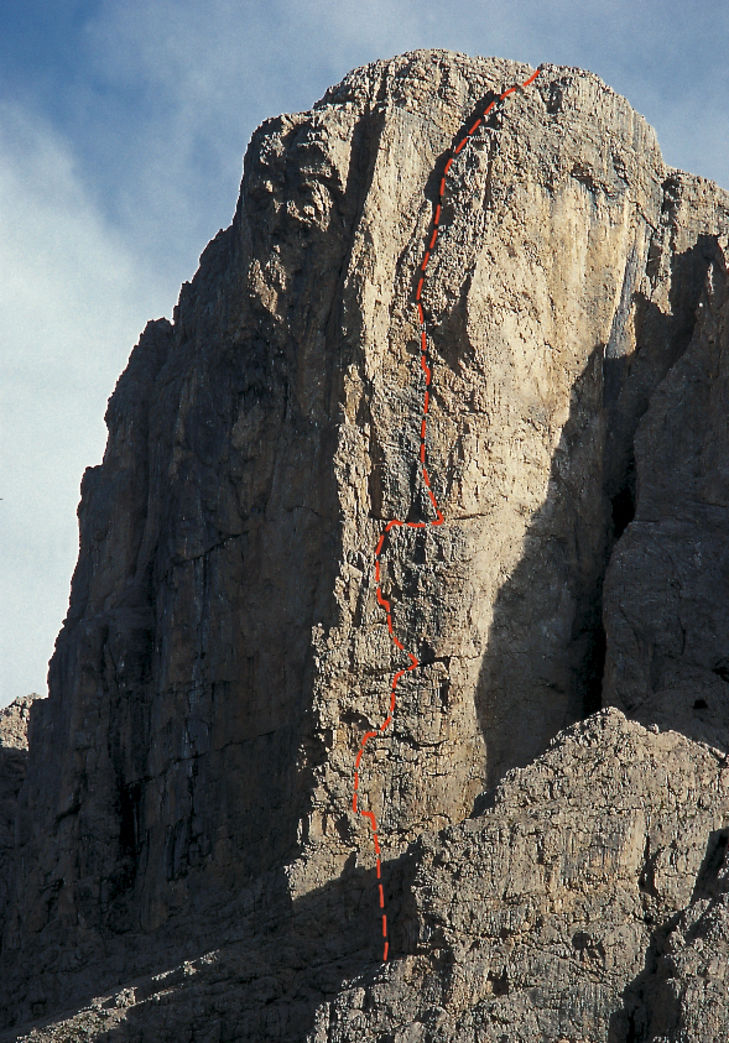 Sellagruppe. Schwierigkeit: V+, mehrere Stellen VI. Schlüsselstelle 6+.Höhenunterschied: 250 m. Kletterstrecke: 290 m. Seillängen: 10. Stunden: 4–5 . Fels: gut/ausgezeichnet . Ausrüstung: NAA + Friends 2–3 + Stopper 8–9 Wegbeschreibung